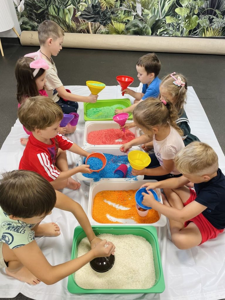 To prawdziwa uczta dla zmysłów! Dzieci dotykają, mieszają, ugniatają, przesypują i brudzą się, korzystając z naturalnych, bezpiecznych materiałów — takich jak mąka, makaron, ryż, galaretka, pianka, farby roślinne czy kasza. Nie ma tu instrukcji ani ocen — każde dziecko działa według własnego pomysłu i tempa. Zajęcia pomagają rozwijać motorykę, wyobraźnię, poczucie sprawczości oraz odwagę w wyrażaniu siebie.